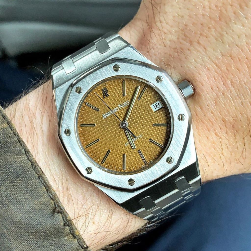 About My Example: The first thing that you’ll notice about my Royal Oak is that the original dark blue dial isn’t dark blue any more. Over the years, this “petit tapisseire” patterned dial was one of the few to have evenly aged to a caramel brown. In watch parlance, this is known as a “tropical dial” because the patina is thought to be a result of sun and heat. In fact, when looked at under a magnifying loupe, you can still see speckles of blue paint throughout.