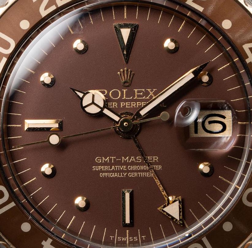 General Notes: This dial is used both on the steel and gold cased 1675/3 and gold 1675/8 during the 1970s. It continues to use the matted, grainy surface first introduced on the Mark 2 brown dial.