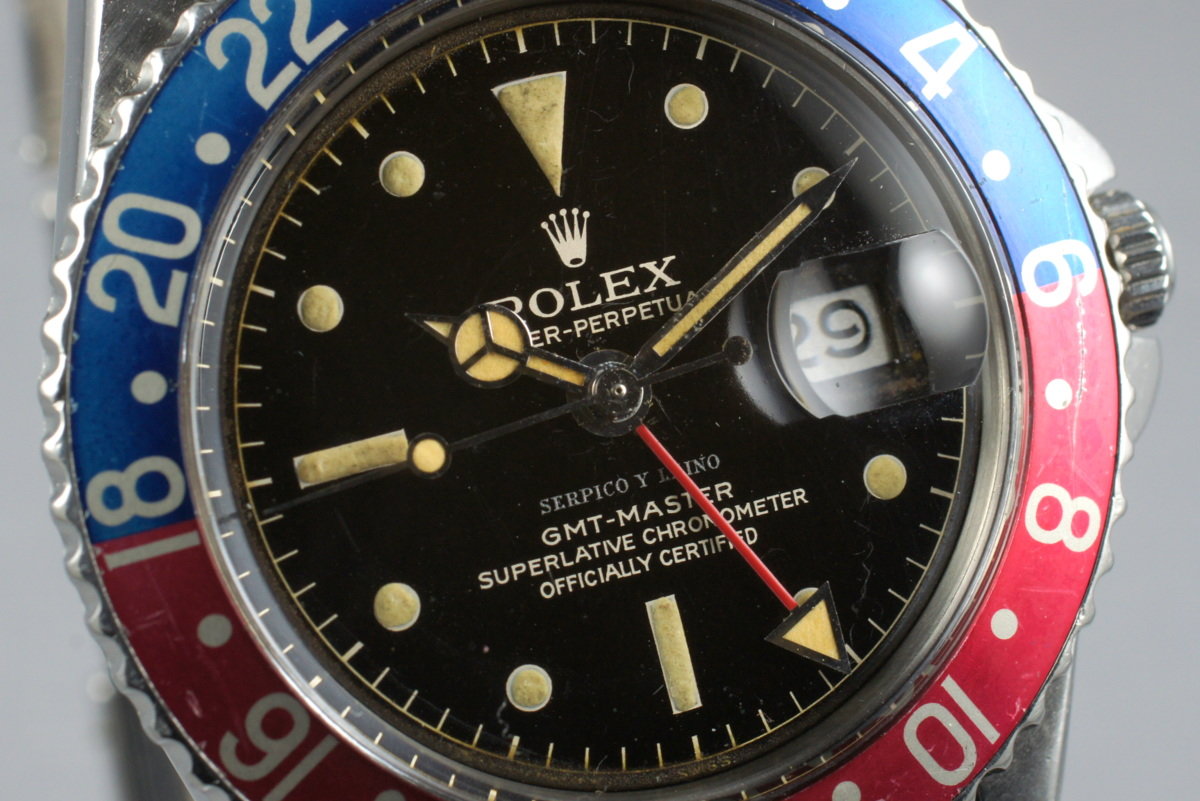 General Notes: This dial is the earliest variant of the “Superlative Chronometer / Officially Certified” (SCOC) dial on the 1675. This designation continues on Rolex watches through today.