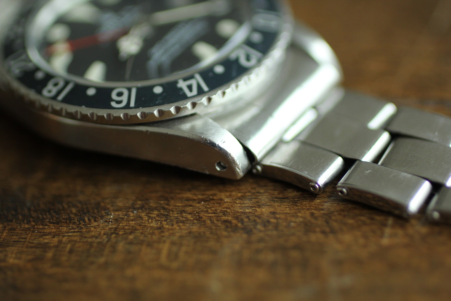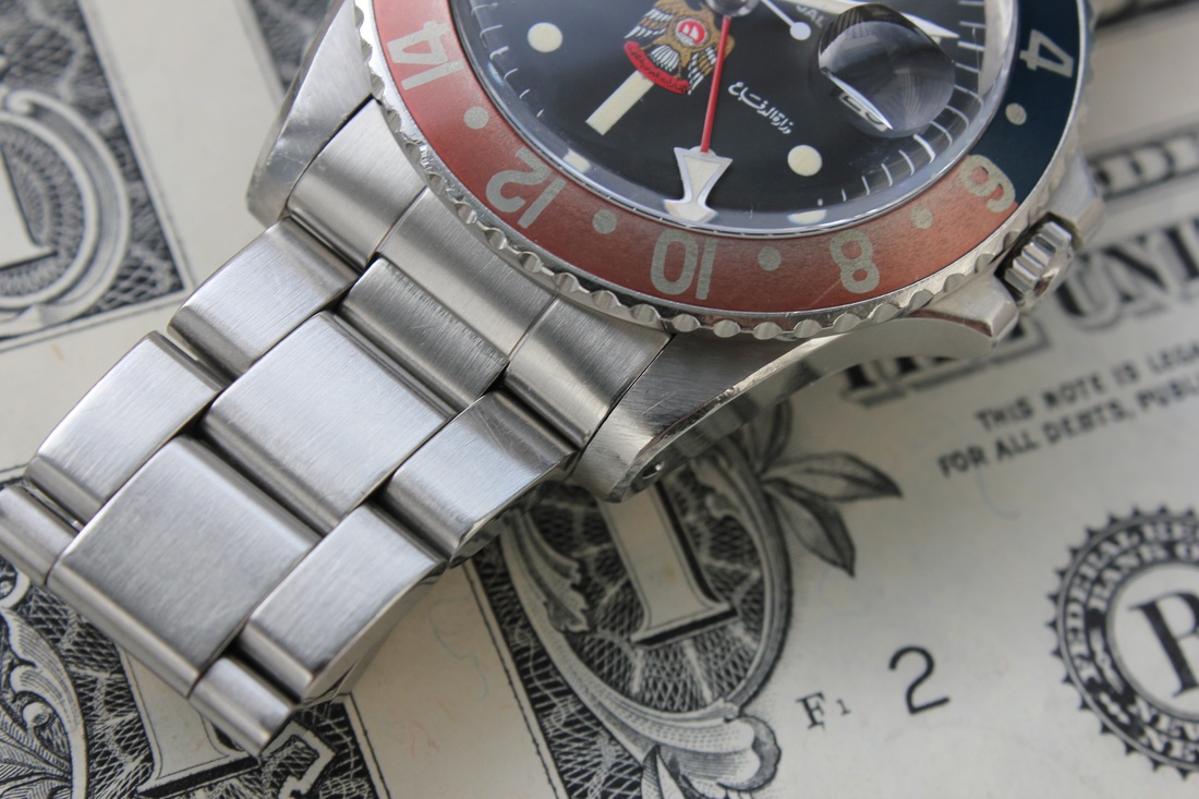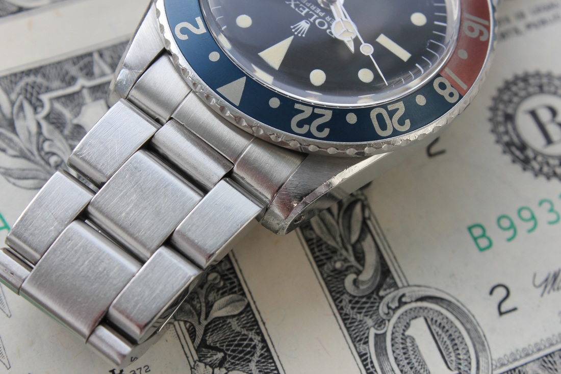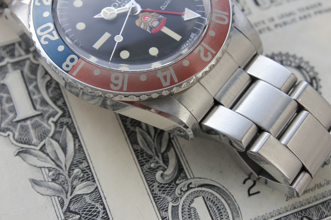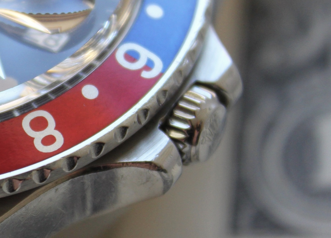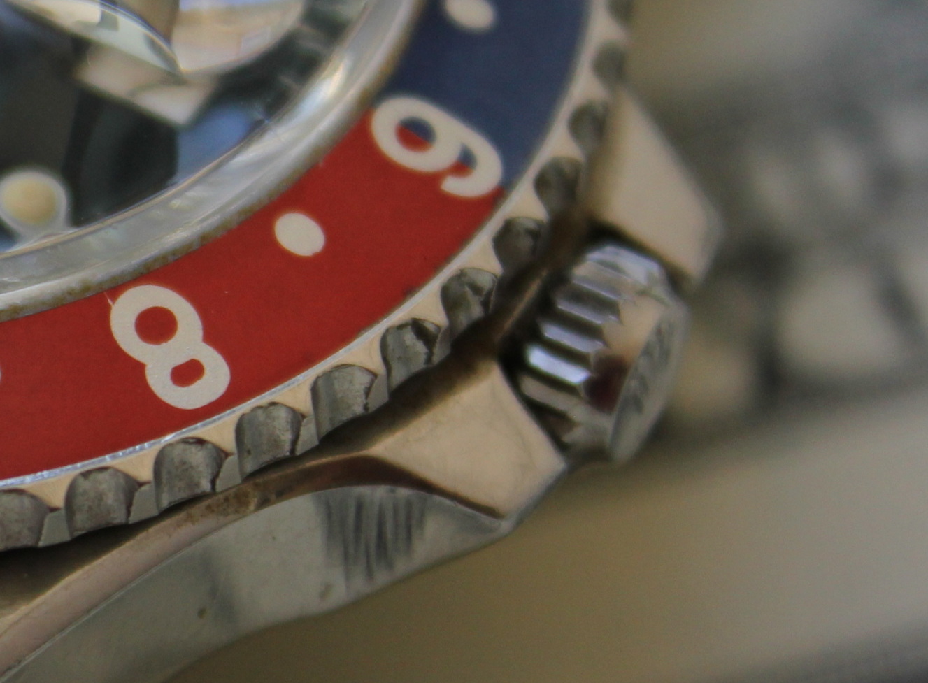 Crown: The 1675 used the “twinlock” crown that was 5.3 mm in diameter. It features the Rolex coronet with an underline underneath. The twinlock crown system has two rubber gaskets. One gasket is inside the crown and compresses against the threaded tube attached to the watch case. The other rubber gasket is located inside the watch tube and encompasses the winding stem. Together, they prevent water and dust from entering the case. While the gasket in the watch tube can prevent water and dust from entering the movement even while the crown is unscrewed, always screw down your crown. Source