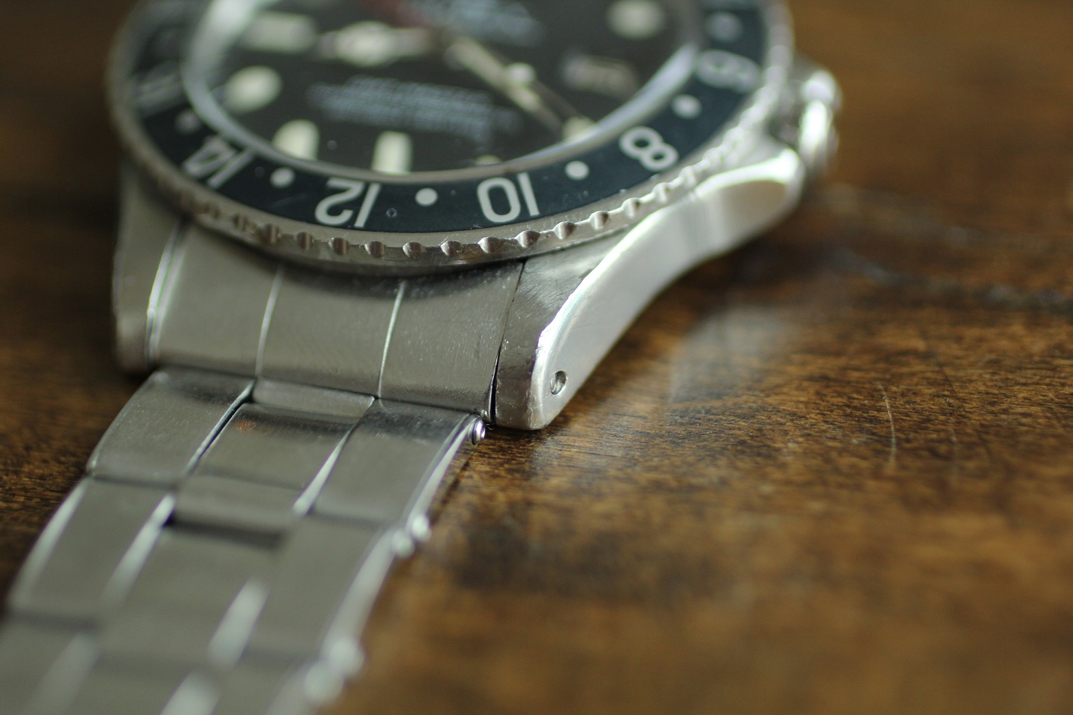 - Rounded (RCG): These crown guards began to appear around SN 1.1-1.2m and remain on Rolex sports watches through the present. While their evolution within the 1675 is subtle, there is a definite shift in shape from their introduction in the mid-1960s through the rest of 1970s. The early style in the 1960s has a long, flat top where the first facet to the side of the case is in line with the edge of the knurling on the crown. This facet moves closer to the case until, in the late 1970s, it starts right at the edge where the crown flushes to the case.