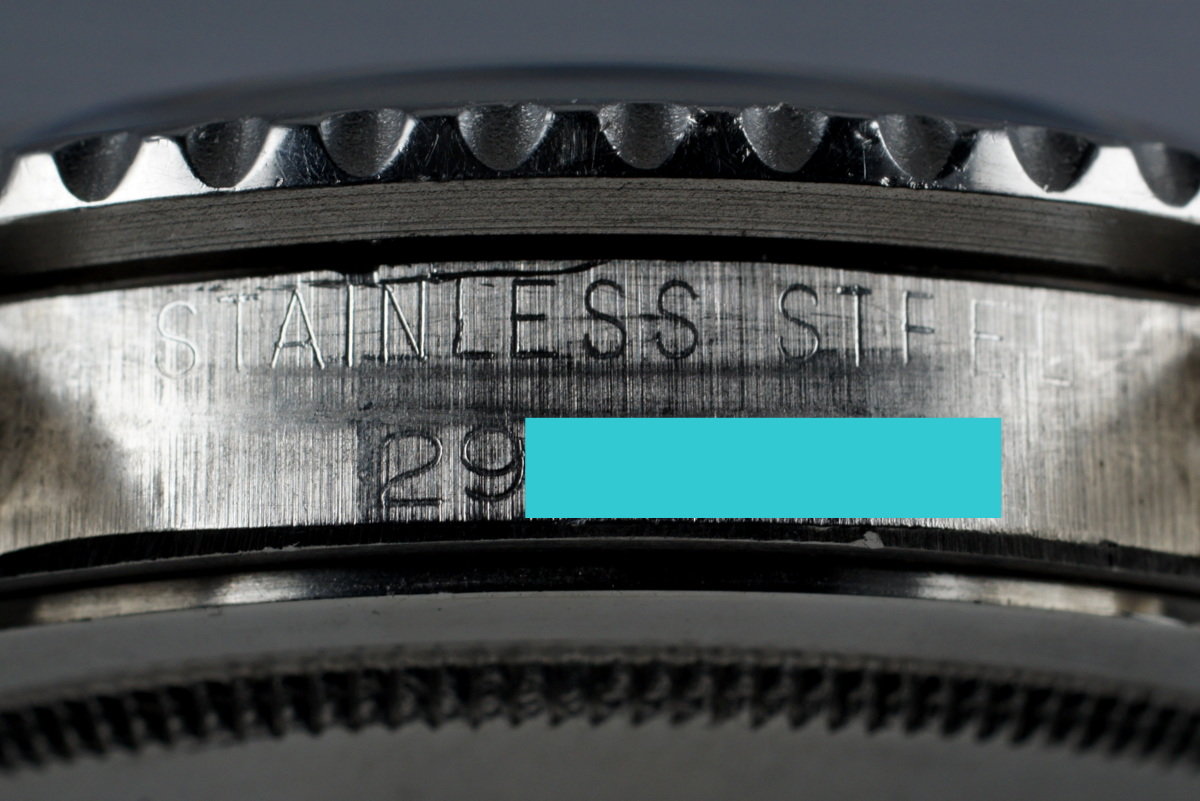 - SN 695,xxx (1960) – 2,8xx,xxx (1970): In this “standard 1960s” engraving, the top position has “REGISTERED DESIGN” on the first line and “1675” on the second line. The bottom position has either a blank top line or “STAINLESS STEEL” and the serial number on the second line. So far, there is not a clear pattern to the 1960s watches having the “STAINLESS STEEL” engraving or a blank space. Both are seen throughout the early and later 1960’s, within the same serial batches, and with both fonts types (see below). I don’t have a good enough sample to determine if these vary by country of delivery, which is another possibility.