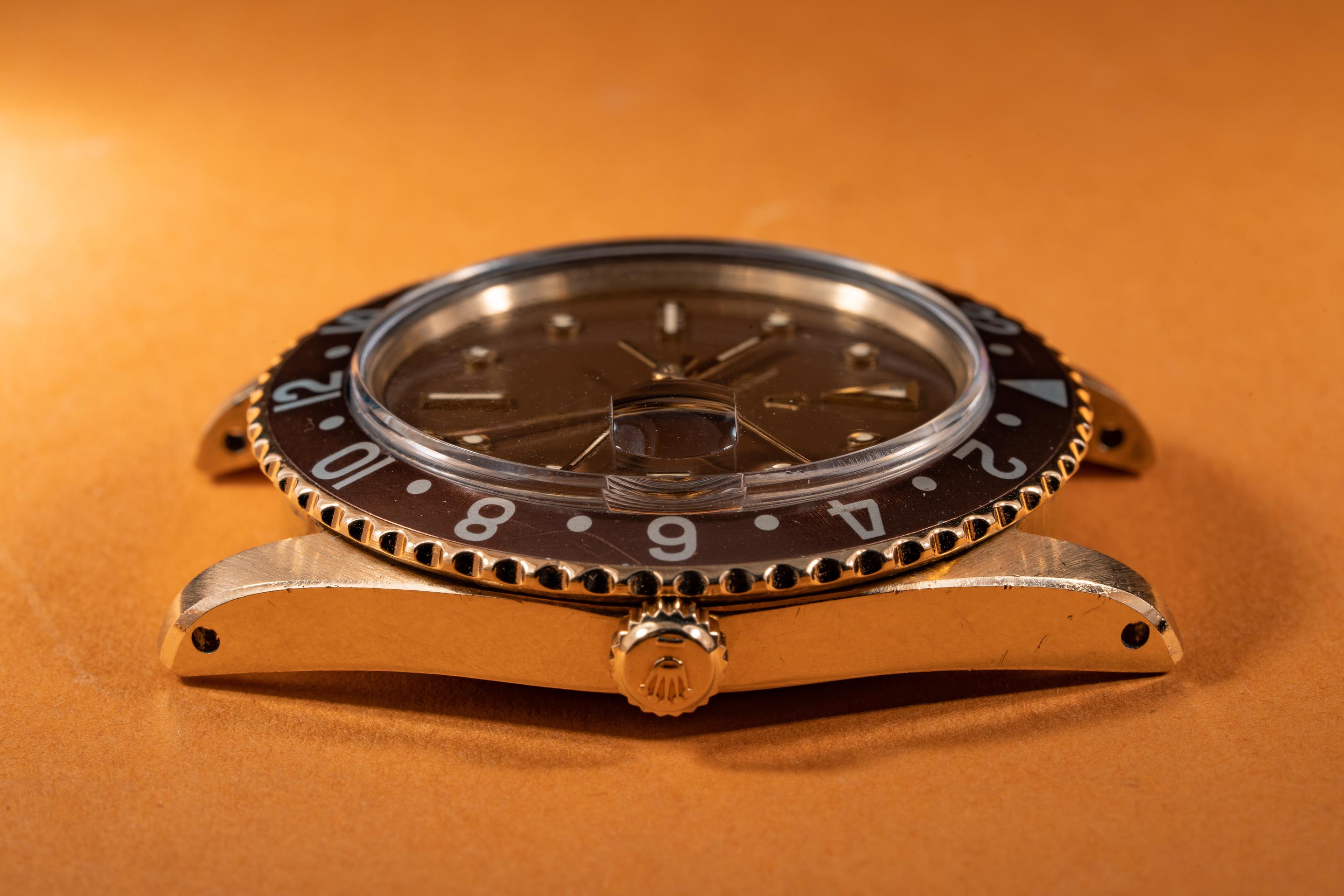 1675/8: The gold cased 1675s did not have PCGs. Instead, the early models were made without crown guards. This makes them appear similar to the 6542, though they retain the case dimensions of the 1675. Crown guards began appears on 1675/8s as early as 134xxxx and the NCG versions stopped being produced around 147xxxx. The crown guards on examples are more shaped and do not have the flat surfaces of the steel mid-cased 1675s.